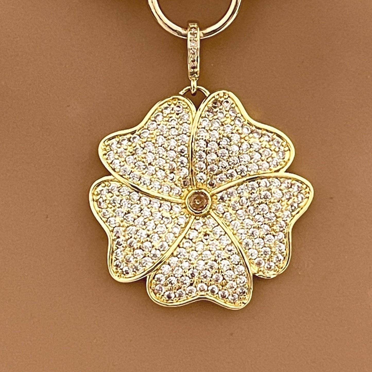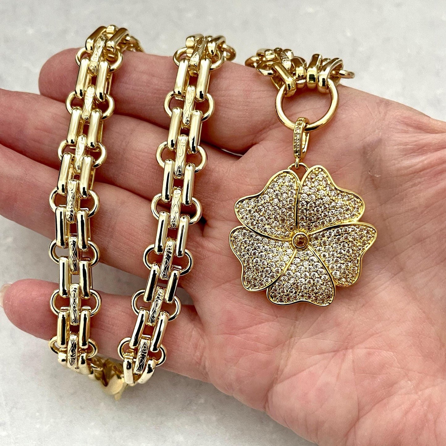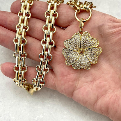This stunning, chunky, gold-textured chain features a Micro Pave Flower pendant. Both the flower pendant and bale are encrusted with Cubic Zirconia stones. The necklace has a lobster claw clasp.