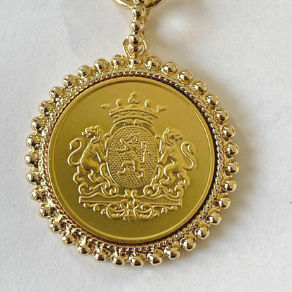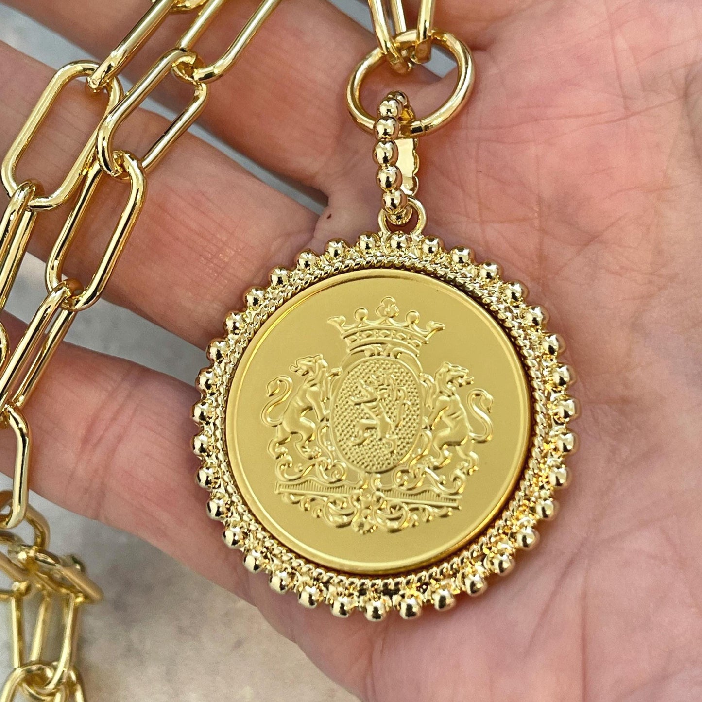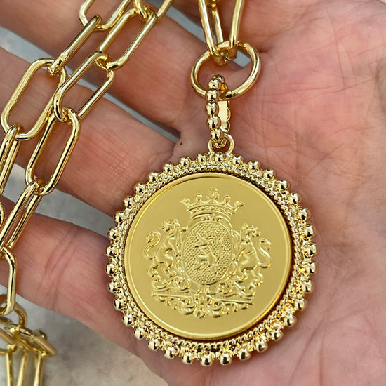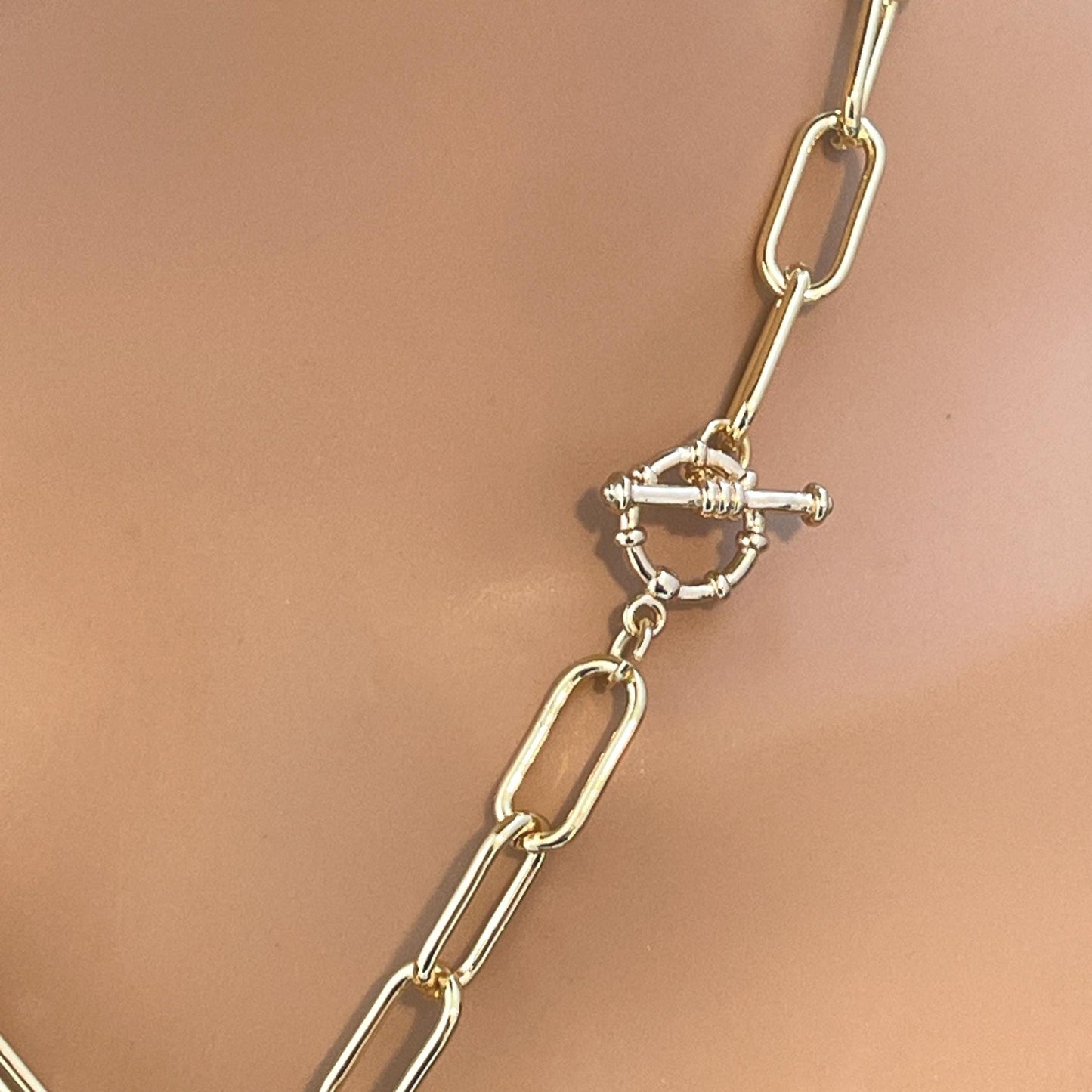 A beautiful brass, gold-plated, paperclip link chain necklace with a gold shield coin pendant. The Pendant has a Textured Bezel, and the chain fastens on the side with a toggle clasp. So unique.