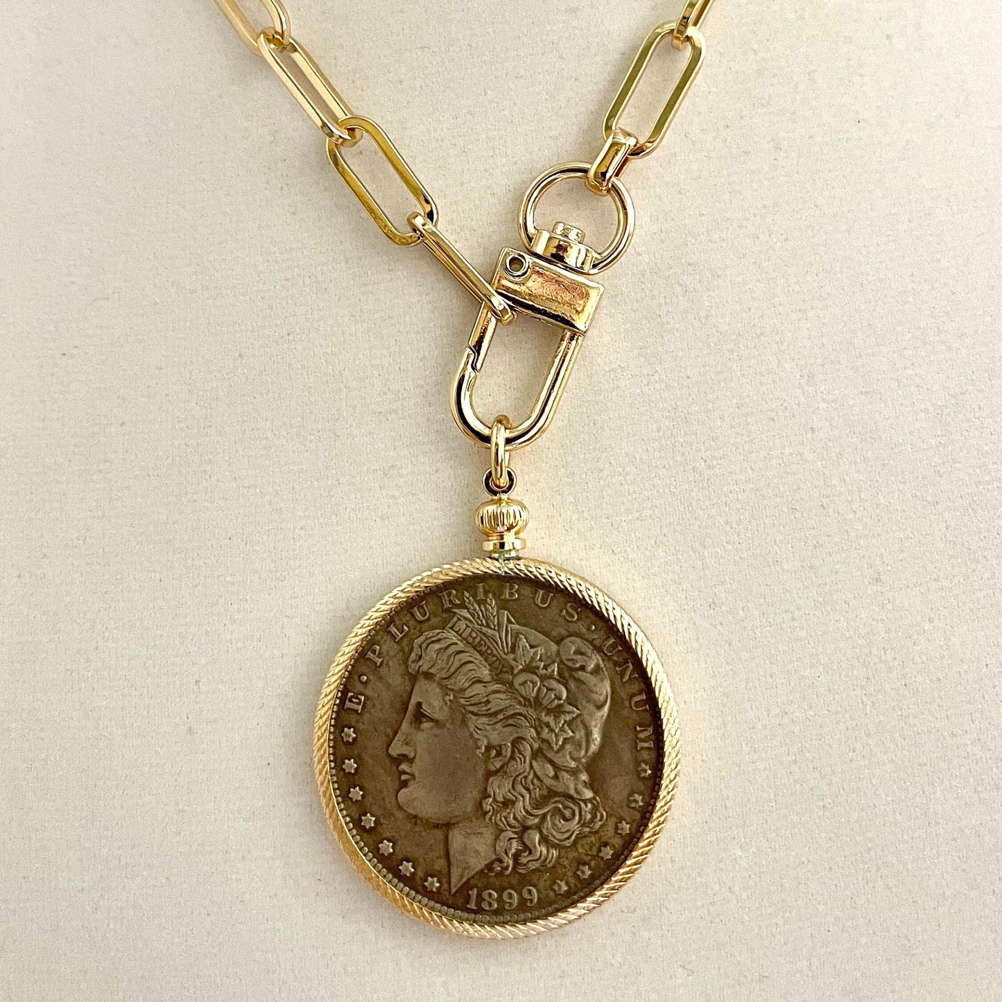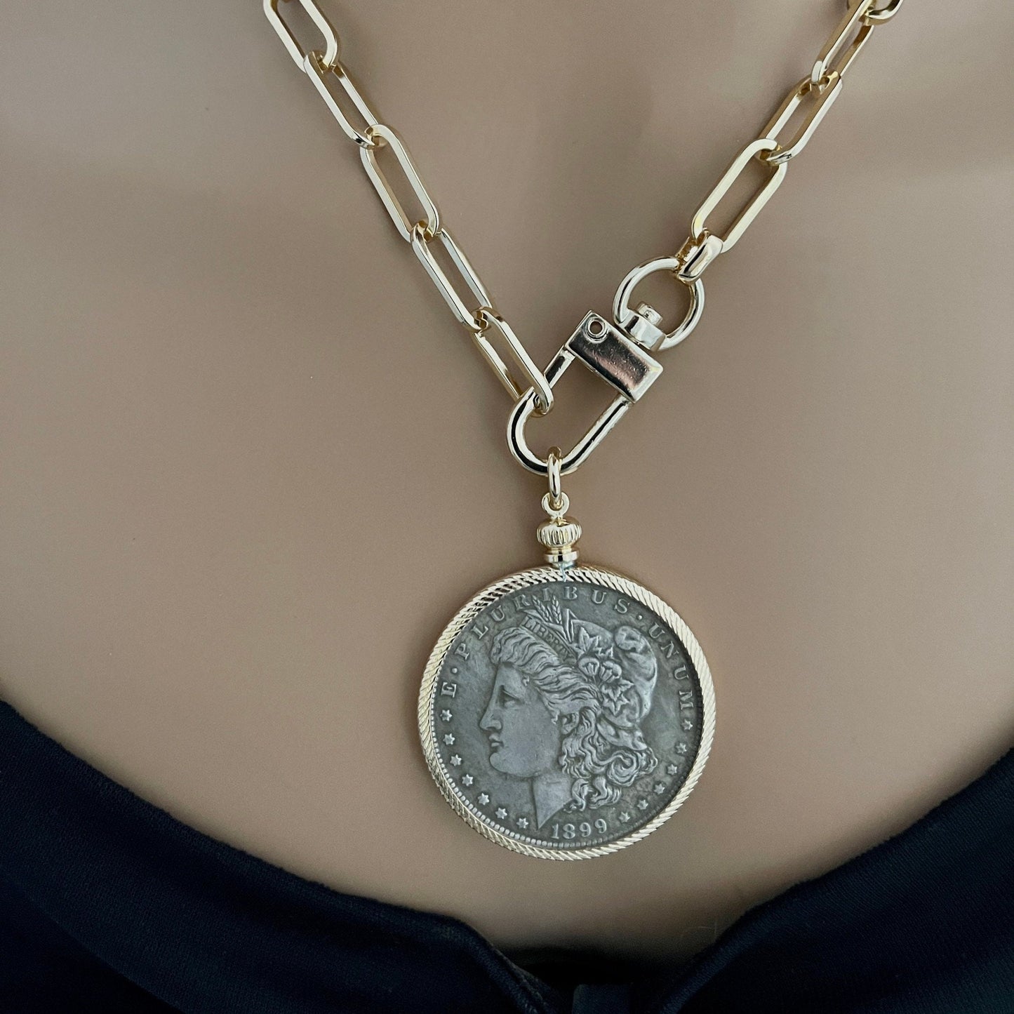 This is a high quality gold plated brass paperclip chain necklace. The reproduction Coin Pendant bezel is 22 K gold plated. The vintage Liberty Coin is in Gunmetal/Burnished Silver with a gold bezel.